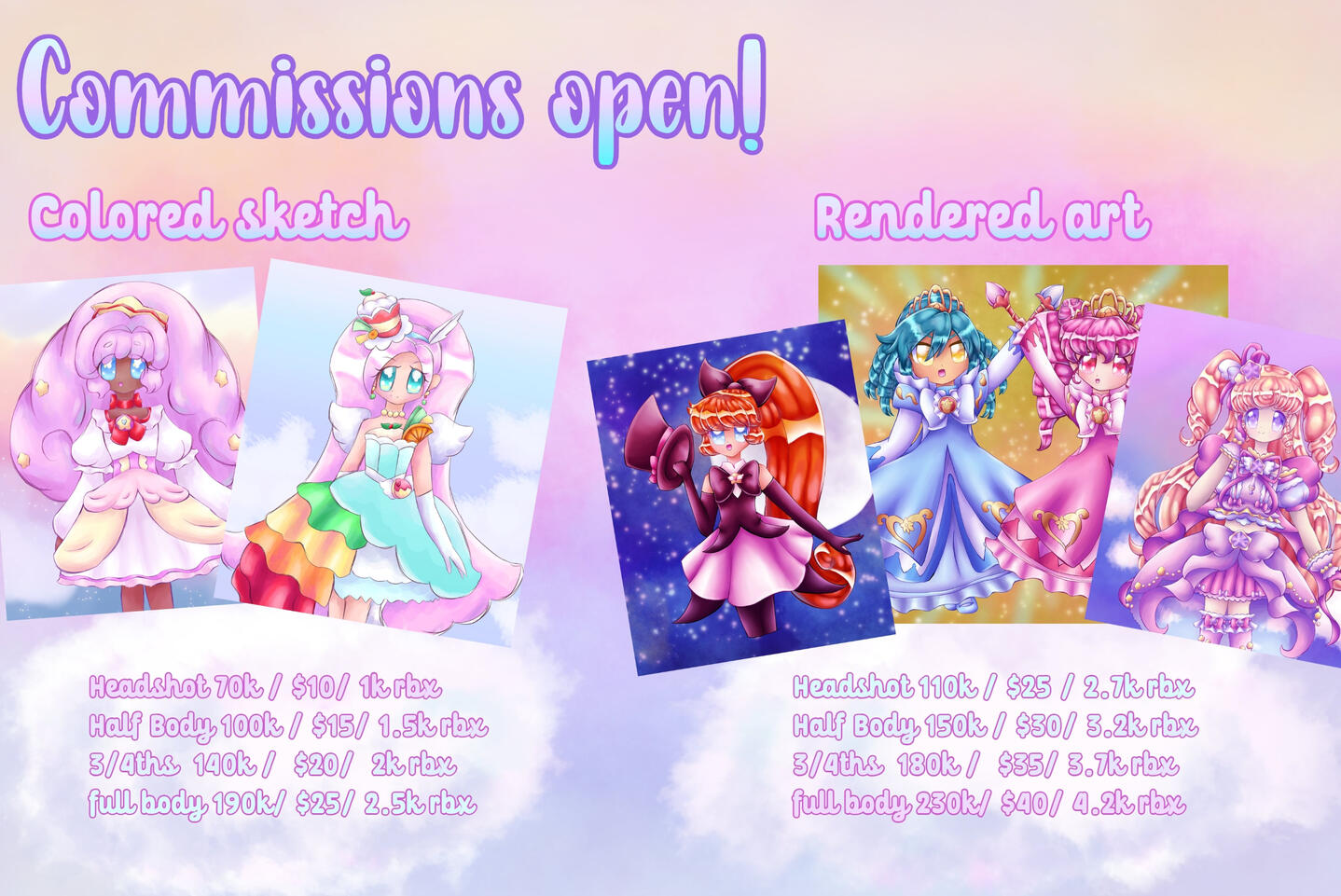 -Payment paid with paypal or RHD after the sketch is done-Payment is in USD, RHD, or robux-I have the right to decline any commission-Refunds are only allowed before I finish Lineart sketch after that I will not be accepting refunds-Personal usage of my art is allowed - commercial usage will cost 15% more than the base price-Prices can change depending on the complexity of the art-My usually turn around time is 2-4 weeks-feel free to ask for updates at anytime or if you want edits made to the pieceThank you for your interest in commissioning me!